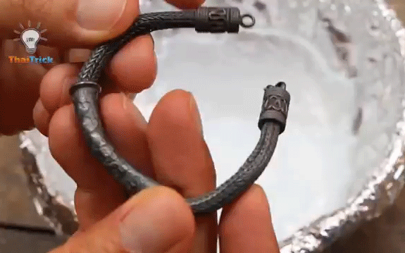Thêm một vài mảnh giấy nhôm vào bát. Thêm đồ trang sức bạc vào bát. Khuấy đều tất cả và để yên trong một vài phút. Các lá nhôm tương tác với muối và loại bỏ màu xỉn. Rửa sạch đồ trang sức bằng nước. Quá trình này có thể cần phải được lặp đi lặp lại một vài lần, nhưng nó rất hiệu quả trong việc khôi phục trang sức bạc của bạn về độ sáng ban đầu của nó.