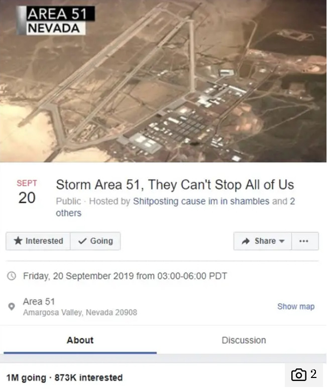 Hơn một triệu người đã tham gia một sự kiện của Facebook cam kết đột kích Khu vực 51 – khu vực cấm của Nevada ở Mỹ, nơi các thuyết âm mưu tin rằng hoạt động của người ngoài hành tinh đang diễn ra.