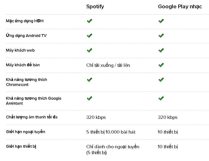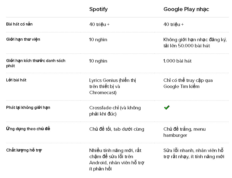 Bạn sẽ chọn đăng ký dịch vụ nào giữa Spotify và Google Play khi xem một so sánh dựa trên chất lượng âm nhạc, giao diện và các tính năng chính khác.