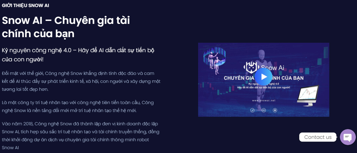 Một web là snowai.net, với lời giới thiệu: “Chuyên gia tài chính của bạn. Snow Ai, Kỷ nguyên công nghệ 4.0 – Hãy để AI dẫn dắt sự tiến bộ của con người. Công nghệ Snow Aihướng tới giao dịch phi tập trung trên nền tảng …”.